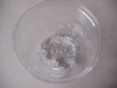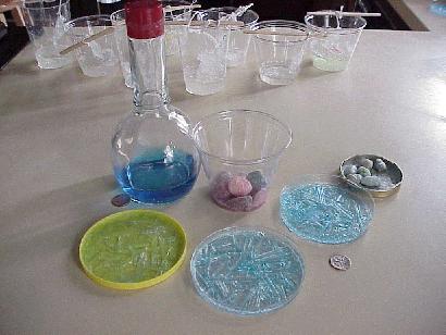 | picture 5: epsom salts solution in bottle, rock crystal gardens, inorganic crystals grown from solution. | picture 6:close up of recently grown magnesium sulphate (epsom salts) crystals - 3.4cm x 0.2cm x 0.1 cm |